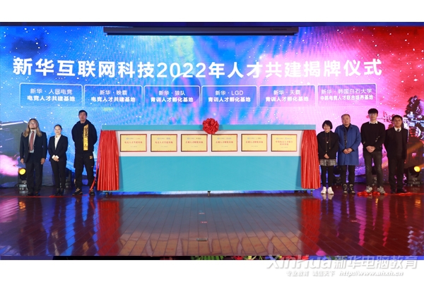 中国东方教育集团电脑事业部副总经理夏伦梅、中国东方教育集团安徽新华高级技工学校副校长颜陈陈携手电竞行业嘉宾一同上台为LGD电子竞技俱乐部、狼队电子竞技俱乐部、天霸电子竞技俱乐部青训人才孵化基地;人民电竞、映霸文化、韩国白石大学电竞人才共建基地六大基地揭牌。