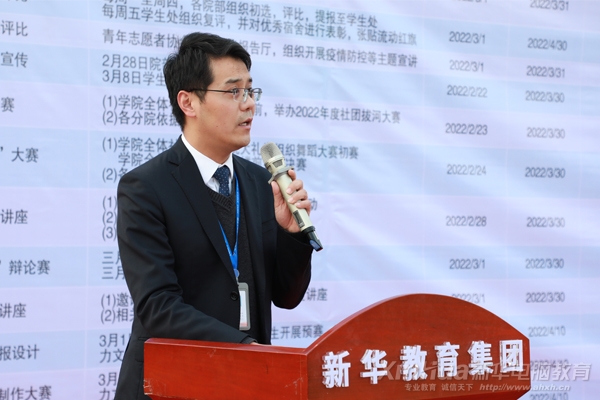 随后,安徽新华电脑专修学院学生处主任王硕在致辞中提到,学校以生为本,在日常的学生管理和校园文化建设中,会不断的开展各色活动,希望所有同学能够把握住第二课程的学习机会,学到专业技能的同时提升品德修养。