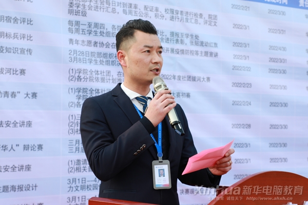 活动仪式上,安徽新华电脑专修学院副院长致开场词,颜院强调:本次活动是向同学们提出了严格的要求,他希望同学们从自身的点滴小事做起,践行学生日常行为规范,做—个遵规守纪、文明礼貌的新华学子,做一个高素质技能人才。