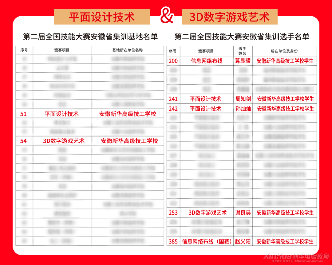安徽新华高级技工学校获批第二届全国技能大赛2个项目省级集训基地,5名同学确定为省集训选手。其中,安徽新华高级技工学校获批第二届全国技能大赛平面设计技术、3D数字游戏艺术集训基地,周知剑、孙灿灿、谢良昊、葛显耀以及赵义阳五位同学入选第二届全国技能大赛安徽省集训选手。