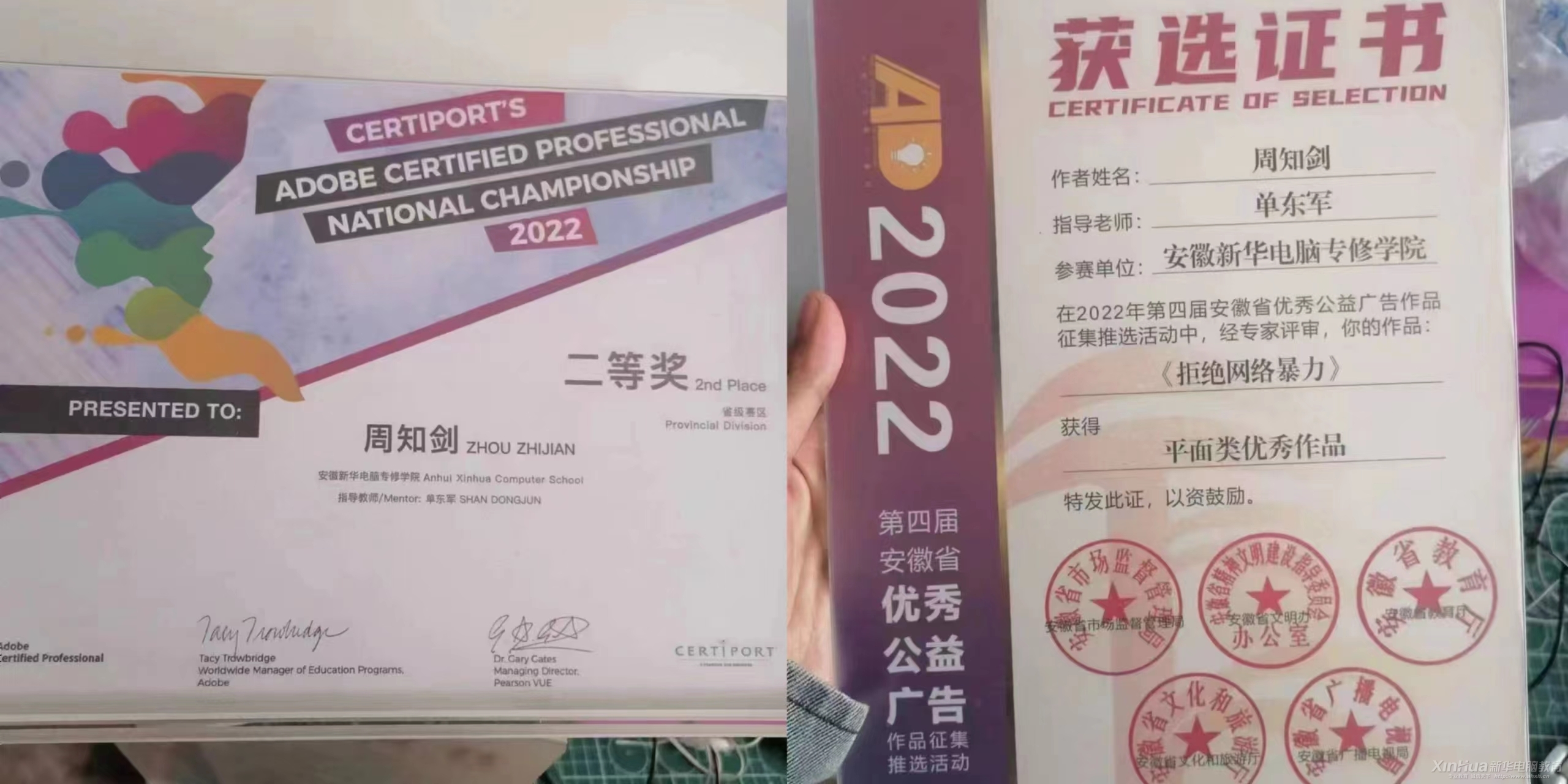 潜心精技,上下求索周知剑认为参加职业技能大赛和项目实践是精技路上必不可少的一环,他在入学第一年就开始跟团打比赛,虽然是团队中的小白,但是他收获颇多,无论是比赛节奏还是竞赛心理,在日积月累中达到了全新的高度。一分努力,一分收获。因专业技能突出,在入学第二年经过校级选拔入选第九届全省职业技能大赛安徽新华高级技工学校平面设计方向代表队,经过层层对抗,周知剑脱颖而出,成功斩获第九届全省职业技能大赛平面设计技术安徽省金奖(安徽省唯一),随后周知剑被确定为第二届全国技能大赛安徽省集训选手,备战国赛。