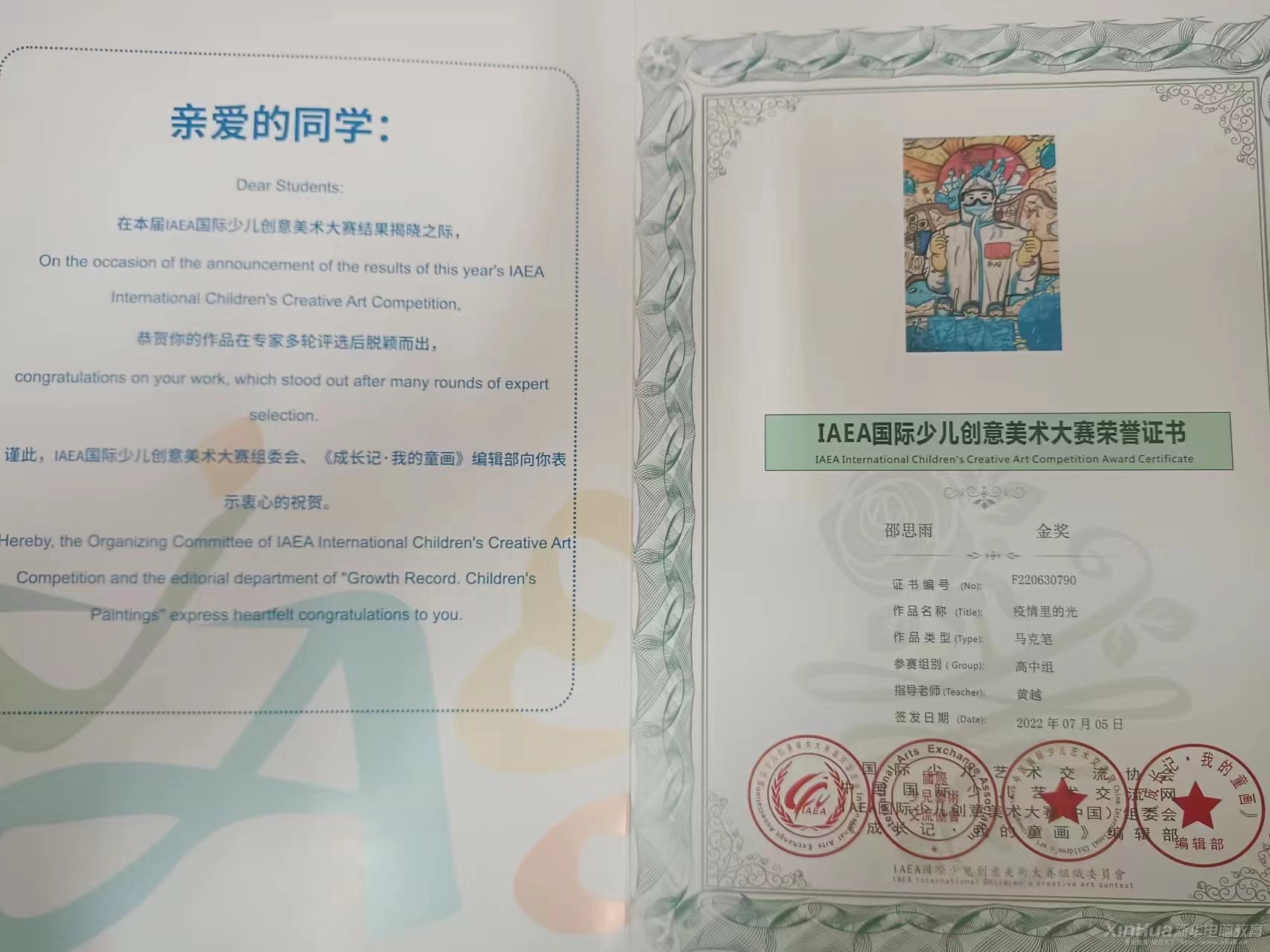 在校我竞选为班级的副班长,以及记者团的组长,还有合唱团的团长。并在2021年评选为社团优秀干部。在这一年多的时间中,我一直在各个方面严格要求自己,获得了全国少儿美术大赛特等奖、IAEA国际少儿创意美术大赛金奖、第十九届“当代杯”绘画二等奖、第二十届“当代杯”儿歌弹唱三等奖、手工制作三等奖、第二十一届“当代杯”故事讲述一等奖、合唱比赛第一名、朗诗比赛第一名、主持人大赛第三名、舞蹈大赛第一名等等。荣誉和奖章是我一直的努力的方向,未来我也希望成为自己的骄傲。