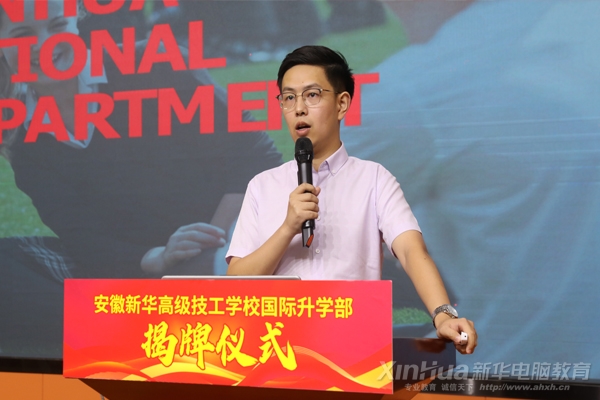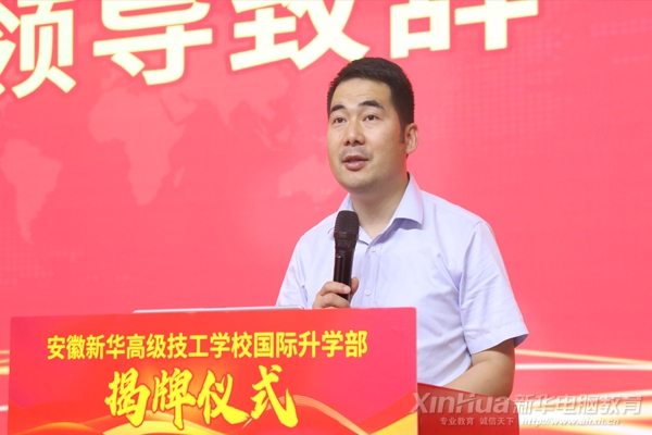 揭牌仪式上,安徽新华高级技工学校副校长王俊发表重要致辞。他表示,安徽新华高级技工学校国际升学部的成立是学校发展的重要里程碑,标志着学校正式迈入国际化办学的新征程。他希望国际升学部能够为学生提供更多的国际交流与合作机会,培养具有国际视野和跨文化沟通能力的技能型人才。