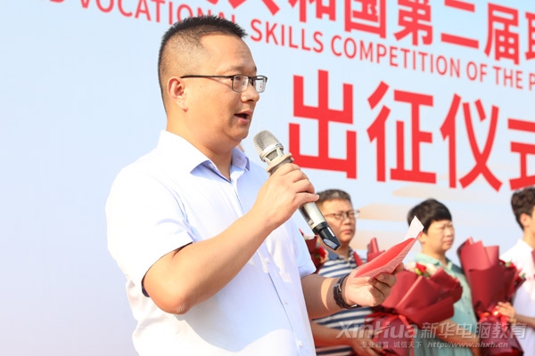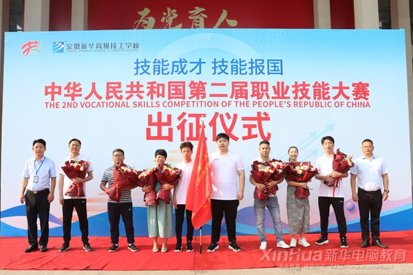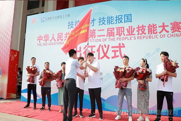 与全国学子同台竞技,新华选手将面对无与伦比的挑战与压力,仪式上安徽新华高级技工学校校长王胜为参赛选手授旗、助威,并与赛项指导教师、参赛选手及选手家长合影留念。