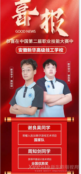 “国之重器,国之匠人”,如今中国技能人才正奔跑在技能强国的路上。当中国制造走向世界,新成长起来的青年一代技能人才,也开始站到了国家乃至世界技能舞台的中央。近日,在中华人民共和国第二届职业技能大赛中,安徽新华周知剑同学获得平面设计技术项目全国优胜奖,谢良昊同学荣耀入选3D数字游戏艺术项目国家队,将代表中国参加2024年在法国举办的世界技能大赛,技能强国和技能成才已然成为时代强音。