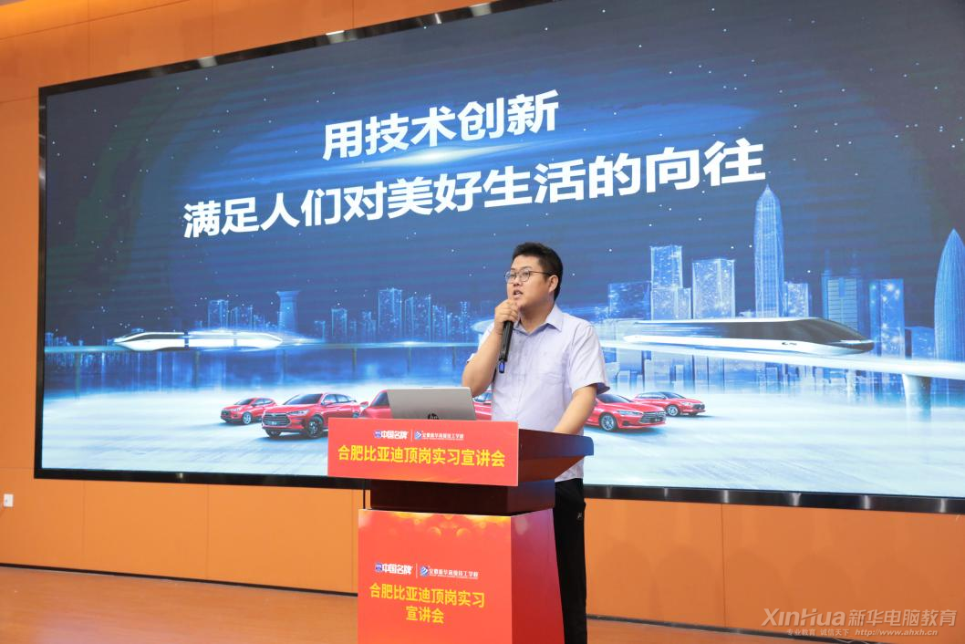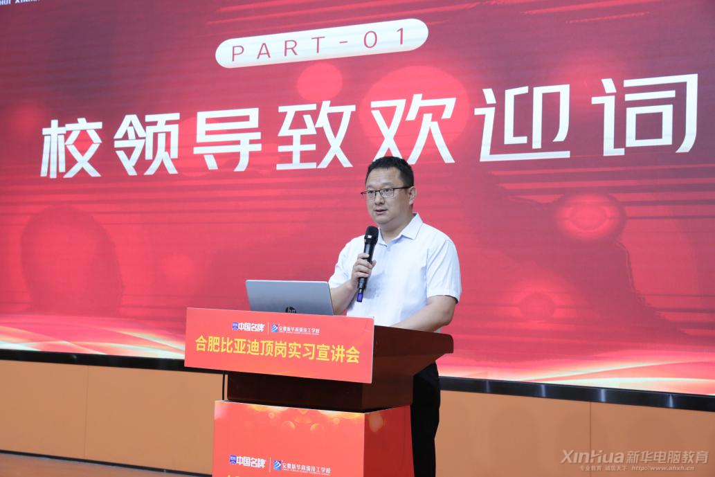 安徽新华高级技工学校校长助理盛文兵出席活动并致辞。校长助理高度赞扬了比亚迪公司的前瞻性和责任感,对比亚迪的宣讲表示热烈欢迎,强调了本次合作对于提升学生实践技能和就业竞争力的重要意义,同时也表达了对学生们能够在实习中学习到最新技术、获得宝贵经验的热切期望。