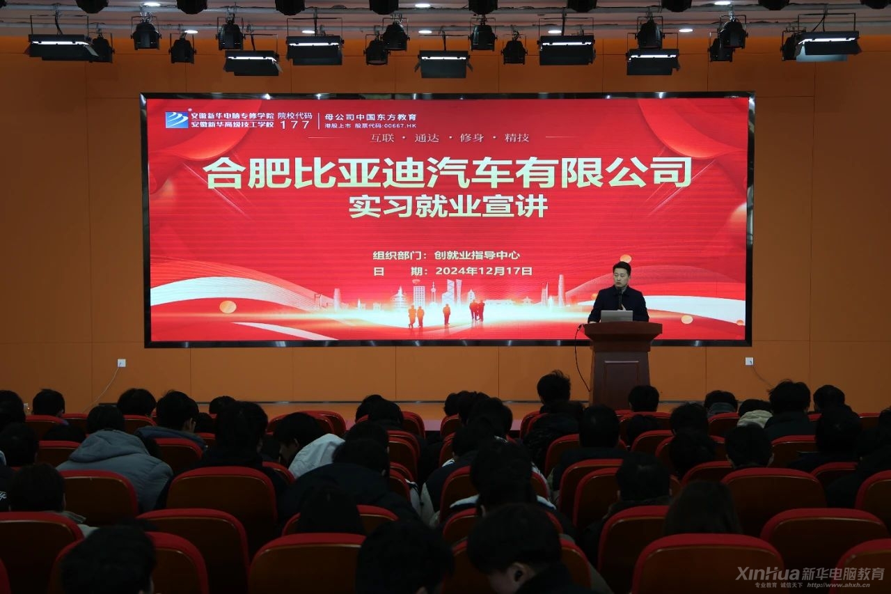 为进一步深化产教融合、校企合作,推动顶岗实习制度,助力毕业生高质量就业。12月17日,学校创就业指导中心联合合肥比亚迪顶岗实习宣讲会在学校报告厅举行,合肥比亚迪汽车有限公司人事主管吴齐主讲,宣讲会吸引200余名学子参与。
