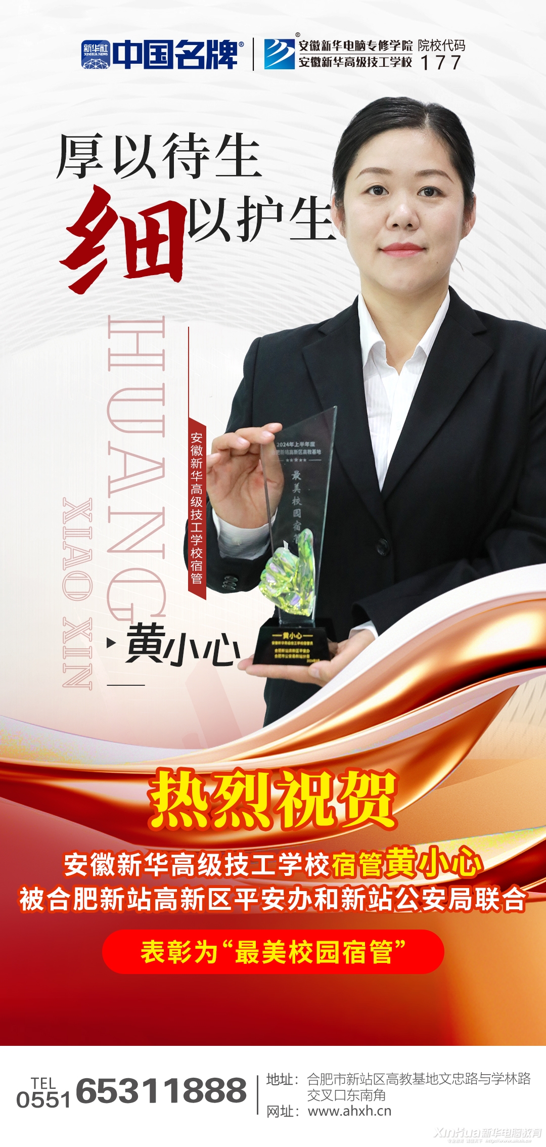我们相信,在全校师生的共同努力下,安徽新华高级技工学校的明天一定会更加美好!让我们再次向黄小心老师表示热烈的祝贺和崇高的敬意!