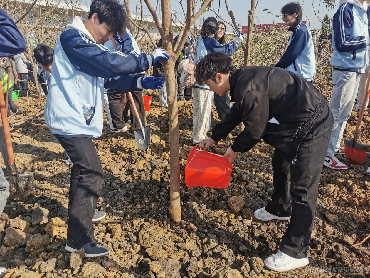 活动当日,阳光明媚,来自安徽新华的学生们早早抵达新站区指定植树地点。在专业人员的指导下,学生们热情高涨地投入到植树活动中。他们分工明确,有的挥锹铲土,有的扶苗填坑,有的浇水灌溉,每一个步骤都认真细致。现场气氛热烈,大家齐心协力,为城市增添了一片新绿。