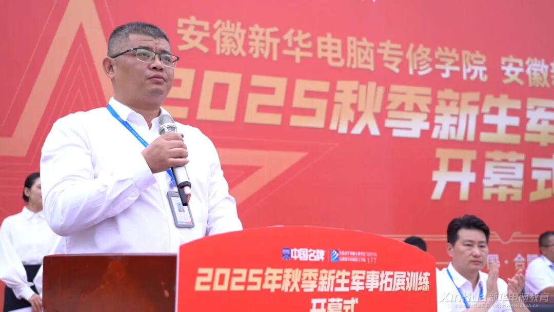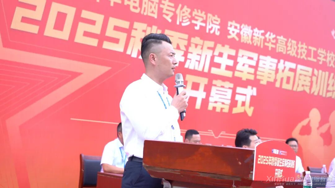 校长助理汪明明发表讲话。他代表学校向支持军训工作的各部门及全体教官表示慰问,并向参训新生提出期望,期待同学们要敢于吃苦、迎难而上,锤炼坚强意志,严守纪律、团结协作,培养优良作风,把军人品质转化为学习的动力。最后,他郑重宣布:“安徽新华高级技工学校2025年秋季新生军事拓展训练正式开始!”顿时,全场响起热烈掌声,各连队有序奔赴训练场地,军事训练正式拉开帷幕。