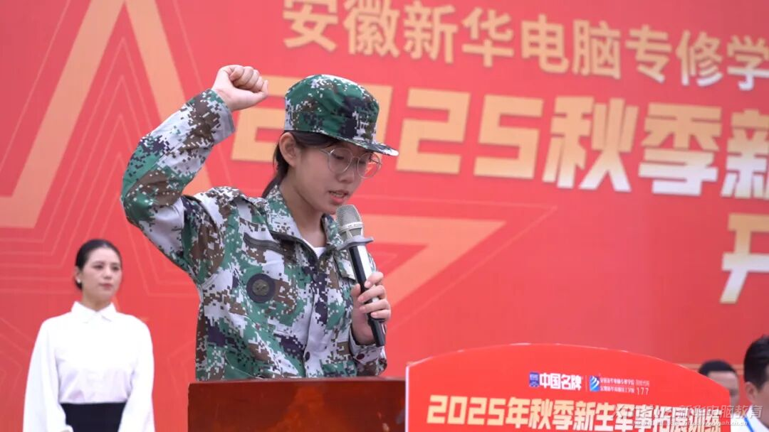 动漫2503班李梦琪同学作为新生代表发言,表达了迎接军训挑战的决心。她带领全体新生庄严承诺:必将以饱满的热情投入训练,遵守纪律,服从命令,磨炼坚强意志,培养优良作风,以优异的训练成绩向学校、向教官、向家长汇报。