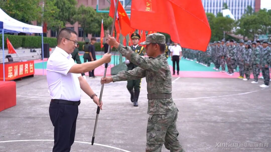 在激昂的乐曲声中,校长助理盛文兵向军训团授旗。旗帜不仅是荣誉和象征,更是责任与使命的传递。接过旗帜,意味着军事拓展训练任务的正式开始,也标志着一段锤炼与成长之旅的启程。