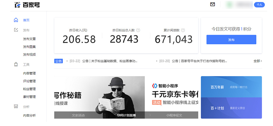 • 经营一个教育类的自媒体帐号,4个多月吸粉2万+,业余时间做百家号自媒体一个月收益5000~6000。