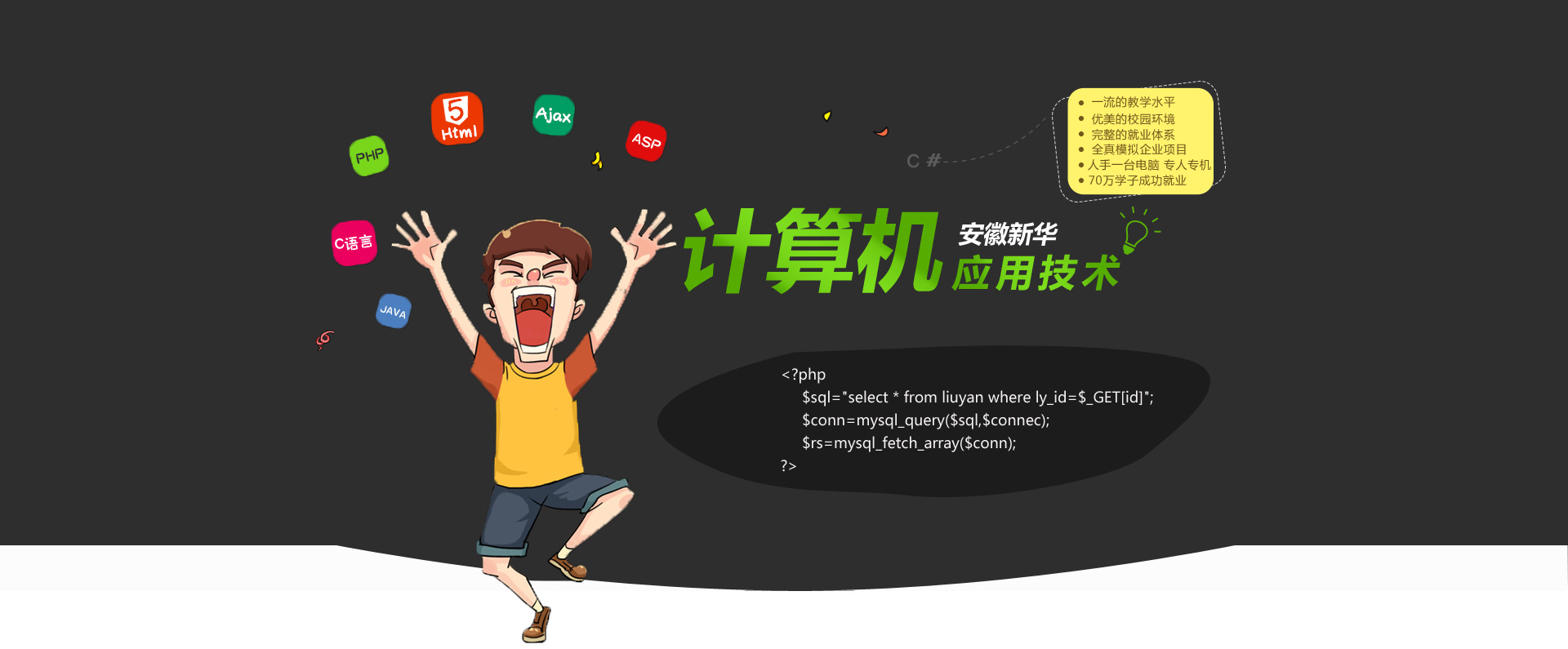 C语言程序设计、SQL SERVER 高级应用、PHP程序设计、jQuery高级编程、HTML5与CSS3开发、Asp.net开发、JAVA面向对象程序设计