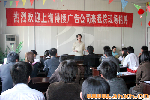 上海得搜广告是上海排名前三位的大型网络公司,4月7日上午得搜广告培训部经理韩璐来安徽新华电脑专修学院南区招聘,这是他们今年第二次来新华招聘。