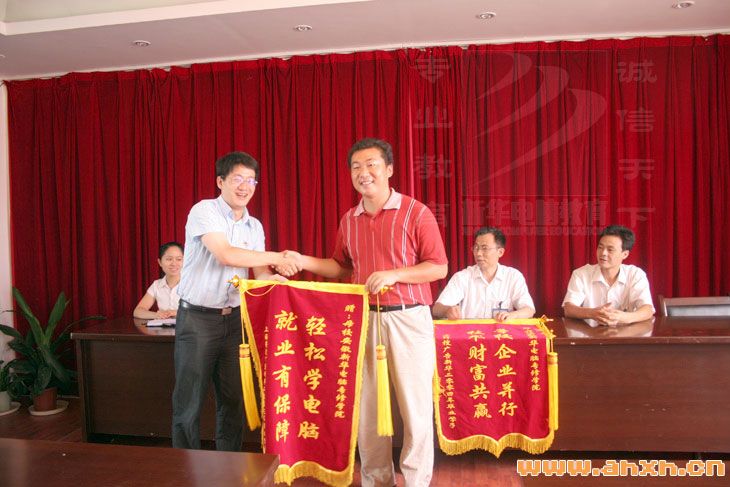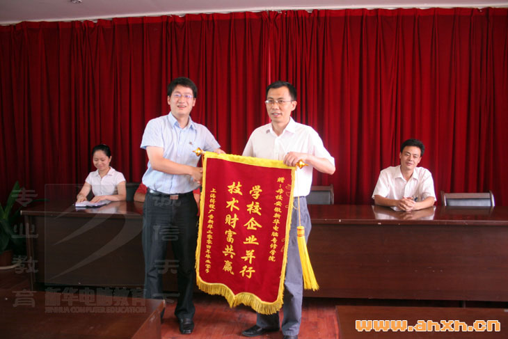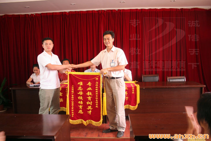 赠旗仪式在西区第一会议室隆重举行,上海得搜广告公司经理韩璐、安徽新华电脑专修学院副院长束开俊、院就业办主任郑成鲲、院西区主任张荣福以及老师代表和部分在校学子参加了仪式。