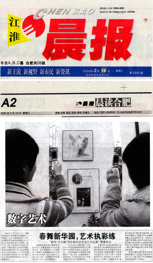 2006年2月13日上午,安徽新华电脑专修学院内彩旗飘展,人声鼎沸,处处洋溢着青春的气息,由安徽新华电脑专修学院主办、中国CG联盟提供技术支持的“新华·中日韩·国际数码艺术设计作品展”开幕式将在这里拉开序幕,带领全体新华学子和社会各界热爱CG艺术的有志人士共同品味具有创意性、原创性、艺术性、趣味性、积极性等国际特性的CG艺术餮饕盛宴。