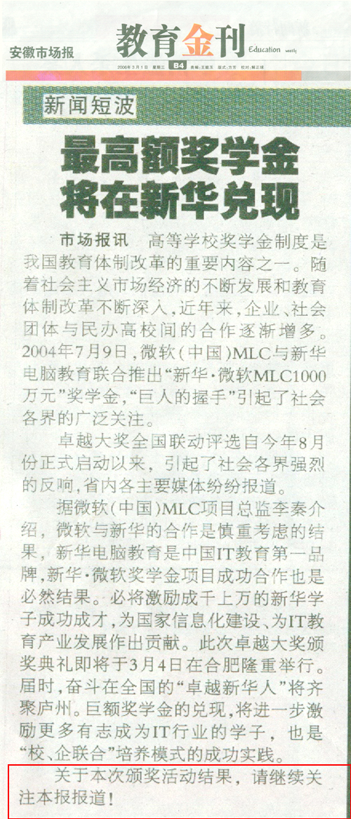 3月1日,《安徽市场报》“教育金刊”版报道“最高奖学金将在新华兑现”的新闻并做了详细报道,敬请关注!