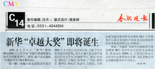 2006年3月4日,“新华·微软MLC1000万元”奖学金,卓越大奖颁奖典礼将在合肥隆重举行。届时,奋斗在全国的“卓越新华人”将齐聚庐州。