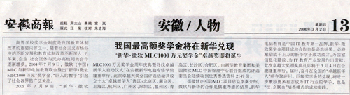 3月2日,《安徽商报》报道“我国最高额奖学金将在新华兑现——‘新华·微软MLC1000万元奖学金’卓越奖即将诞生”的新闻并做了详细报道,敬请关注!