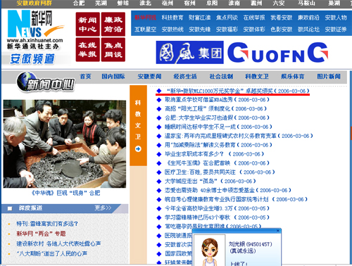 2006年3月4日上午,“新华·微软MLC1000万元奖学金”卓越奖颁奖典礼在安徽新华电脑专修学院隆重举行。省政协副主席赵培根、省信息产业厅副厅长王洵、省信息产业厅信息化推进处处长罗荣选、安徽省大中专就业指导中心主任鲍勇、微软MLC(中国区)教育总监李秦、安徽新华电脑专修学院院长沙旭等出席了颁奖典礼。获得最佳追求奖、最佳专业奖、最佳开拓奖、最佳成就奖,和卓越奖的11位新华学子也从全国各地齐聚合肥登台领奖。本网对颁奖典礼进行了全程直播,全国20多所新华电脑分校,20多万新华学子通过网络观看了本次颁奖典礼。