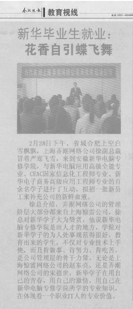3月6日,《合肥晚报》教育视线版报道了“新华毕业生就业 花香自引蝶飞舞”的新闻,并做了详细报道,敬请关注!