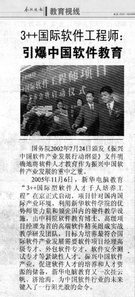 3月6日,《合肥晚报》教育视线版报道了“3++国际软件工程师:引爆中国软件教育”的新闻,并做了详细报道,敬请关注!