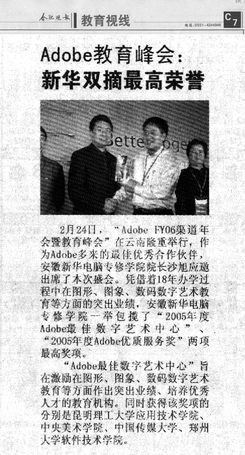2006年2月24日,“Adobe FY06渠道年会暨教育峰会”在云南隆重举行,作为Adobe多来的最佳优秀合作伙伴,安徽新华电脑专修学院院长沙旭应邀出席了本次盛会。凭借着18年办学过程中在图形、图象、数码数字艺术教育等方面的突出业绩,安徽新华电脑专修学院一举包揽了“2005年度Adobe最佳数字艺术中心”、“2005年度Adobe优质服务奖”两项最高奖项。