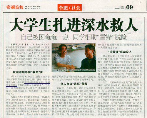 3月7日,《安徽商报》报道“大学生扎进深水救人——自己被困奄奄一息 同学相助“雷锋”脱险”的新闻并做了详细报道,敬请关注!