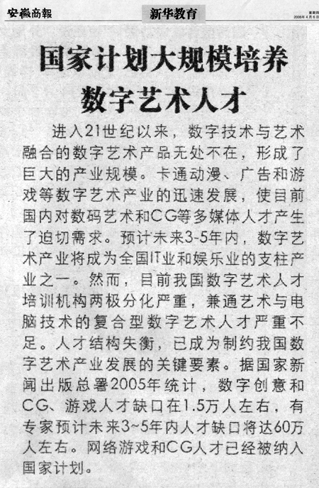 4月6日,《安徽商报》报道:“国家计划大规模培养数字艺术人才”的新闻,敬请关注!