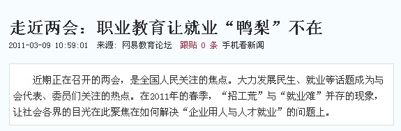 近期正在召开的两会,是全国人民关注的焦点。大力发展民生、就业等话题成为与会代表、委员们关注的热点。在2011年的春季,“招工荒”与“就业难”并存的现象,让社会各界的目光在此聚焦在如何解决“企业用人与人才就业”的问题上。