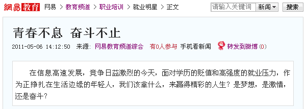 网易教育频道讯 在信息高速发展,竞争日益激烈的今天,面对学历的贬值和高强度的就业压力,作为正挣扎在生活边缘的年轻人,我们该拿什么,来赢得精彩的人生?是梦想,是激情,还是奋斗?
