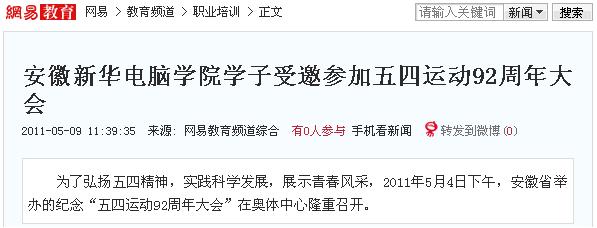 《网易教育频道》报道:安徽新华电脑学院学子受邀参加五四运动92周年大会