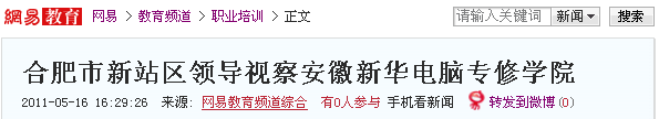 新站区领导一行人参观了安徽新华电脑学校职教城校区的就业指导中心,对学院就业安置模式工作给予了肯定:新华电脑专修学院的“复合型人才培养计划”是符合国家人才储备纲领的,也是非常符合市场需求的。它具有强大的生命力,希望新华电脑学院能够走出一条有特色的校企合作之路,新站区也将为安徽新华电脑专修学院的学生就业特别是校企合作方面提供最大范围协助和支持!