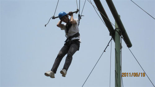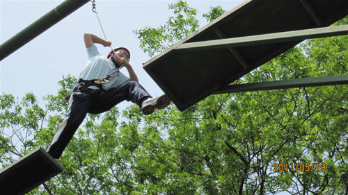接下来的“过情侣桥”项目依然有难度,但大家却更加积极主动地参与,生怕错过就再也没有机会。看着大家顶着烈日和疲惫,尝试着完成训练。笔者深深地感动和佩服他们。记得当时连最柔弱的那个女孩都笑着说道:“最后一次机会留给我!”那时,没有人再想着退缩和逃避,而是学会了勇于面对和尝试,这便是此次拓展训练所要达到又一个目标。
