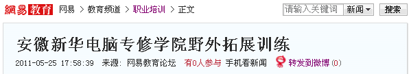 网易教育讯 5月19号,安徽新华电脑专修学院组织一次新员工野外拓展训练,笔者有幸观看了这29位新人训练的全过程,这是一次不同寻常的经历。