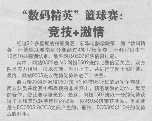 经过2个多星期的精彩角逐,新华电脑学院第二届“数码精英”杯篮球联赛南区分赛经过4轮17场争夺,于4月7日中午12点10分圆满结束。最终网技0507班获摘得桂冠。