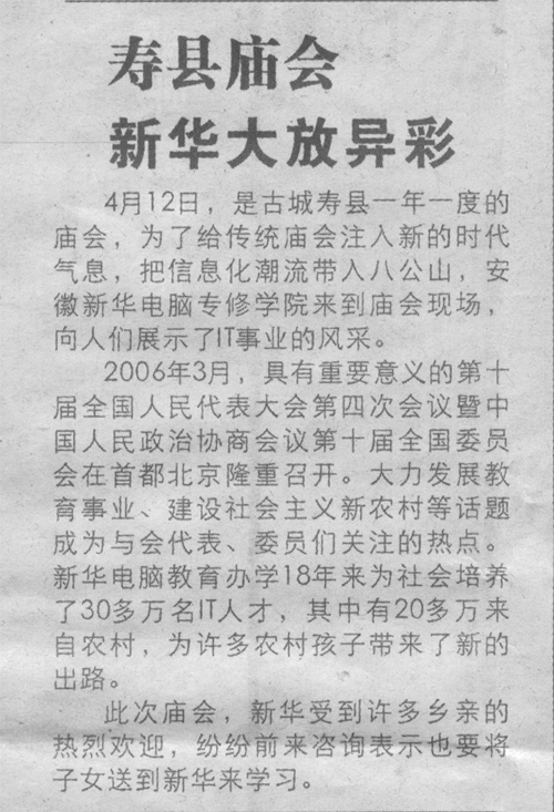 4月12日,是古城寿县一年一度的庙会,为了给传统庙会注入新的时代气息,把信息化潮流带入八公山,安徽新华电脑专修学院来到庙会现场,向人们展示了IT事业的风采。