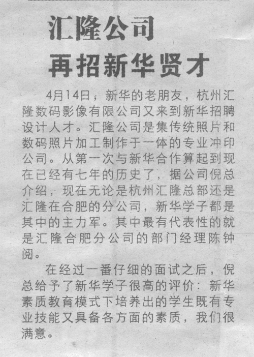 4月14日,新华的老朋友,杭州汇隆数码影像有限公司又来到新华招聘设计人才。汇隆公司是集传统照片和数码照片加工制作于一体的专业冲印公司。从第一次与新华合作算起到现在已经有七年的历史了,据公司倪总介绍,现在无论是杭州汇隆总部还是汇隆在合肥的分公司,新华学子都是其中的主力军。其中最有代表性的就是汇隆合肥分公司的部门经理陈钟阅。