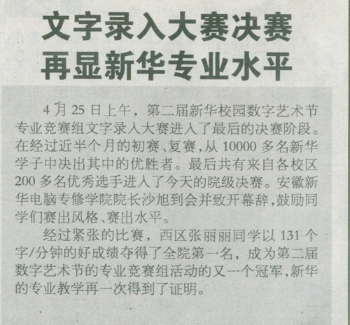 4月27日《安徽商报》教育在线栏目报道“文字录入大赛决赛再显新华专业水平”,敬请关注!