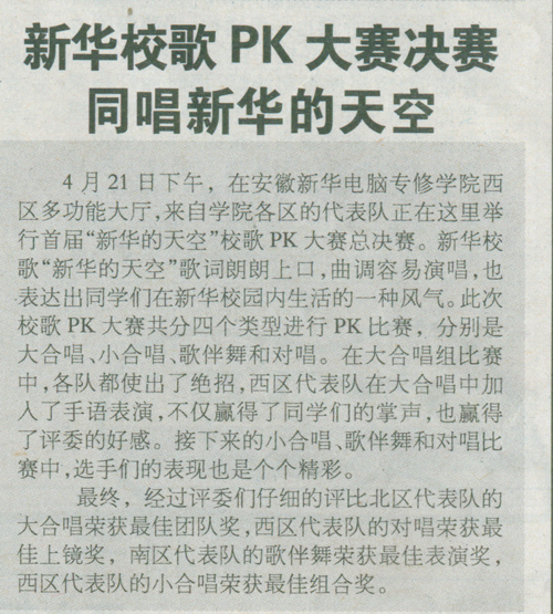 4月21日下午,在安徽新华电脑专修学院西区多功能大厅,来自学院各区的代表队正在这里举行首届“新华的天空”校歌PK大赛总决赛。新华校歌“新华的天空”歌词朗朗上口,曲调容易演唱,也表达出同学们在新华校园内生活的一种风气。此次校歌PK大赛共分四个类型进行PK比赛,分别是大合唱、小合唱、歌伴舞和对唱。在大合唱组比赛中,各队都使出了绝招,西区代表队在大合唱中加入了手语表演,不仅赢得了同学们的掌声,也赢得了评委的好感。接下来的小合唱、歌伴舞和对唱比赛中,选手们的表现也是个个精彩。