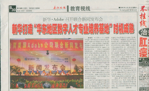 安徽新华电脑专修学院获Adobe数字艺术中心、Adobe数字艺术中心全国示范教育基地和Adobe认证考试管理中心三项殊荣。双方同时宣布,“新华·Adobe数字艺术奖学金”即日启动