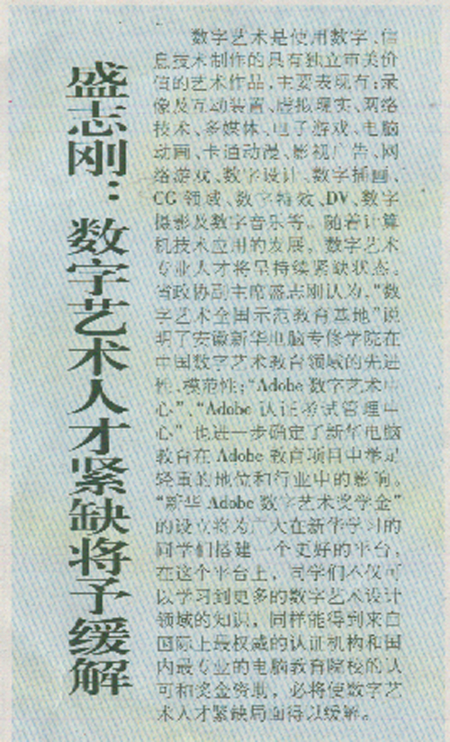 4月29日,《合肥晚报》报道:“盛志刚:数字艺术人才紧缺将予缓解”的新闻,敬请关注!