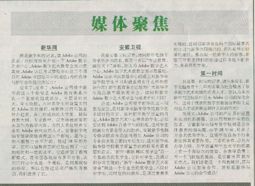 朱聂夫:Adobe公司的产品界面设置和实用性都能强,是应用型软件中的佼佼者。安徽新华电脑专修学院则是全国IT教育的领头雁,办学18年来,培养了万余名优秀学生,这些学生在各个行业都发挥着重要作用。二者的合作,必然在办学方向、办学质量和学生水平的提高上有一个深层次的发展,在教学质量上有一个飞跃性的提高,是安徽省IT教育的亮点。我们合肥是一个科教城市,愿与Adobe公司加深合作,并祝愿新华与Adobe公司的合作成功!