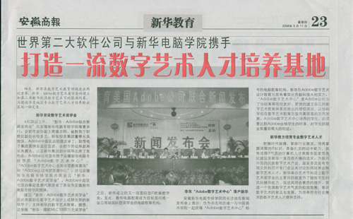 安徽新华电脑专修学院院长沙旭在新闻发布会上表示:作为华东地区惟一与中国美术学院一起获得“Adobe数字艺术中心”称号的电脑教育机构,新华在Adobe数字艺术设计教育方面有着突出贡献和强大的实力。“Adobe数字艺术中心”是Adobe公司为了协助高等院校更好、更快的建立自己的数字艺术教育体系而推出的授权项目,以协助学校在数字艺术教育朝向高层面的方向发展。Adobe数字艺术中心培养的学生,必须要达到Adobe合格学生的标准,对学生的就业有着非常大的助益。