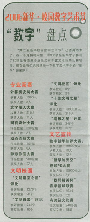 “第二届新华校园数字艺术节”已圆满结束了。在一个月的时间里,10000多名新华学子参与了23项既有浓厚专业性又有丰富艺术性的比赛项目。现在让我们共同盘点一下数字艺术节中的“数字”氛围吧!