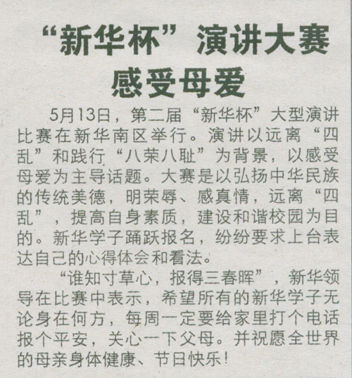 母亲节前夕,安徽新华电脑专修学院举行第二届“新华杯”大型演讲比赛。演讲以远离“四乱”和践行“八荣八耻”为背景,以感受母爱为主导话题。大赛是以宏扬中华民族的传统美德,明荣辱、感真情,远离“四乱”,提高自身素质,建设和谐校园为目的。新华学子踊跃报名,纷纷要求上台表达自己的理解和看法。