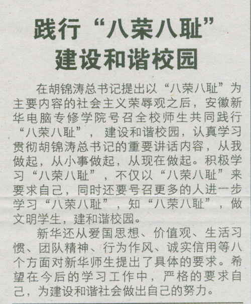 安徽新华电脑专修学院在胡锦涛总书记提出以“八荣八耻”为主要内容的社会主义荣辱观之后,号召全校师生共同践行“八荣八耻”, 建设和谐校园,认真学习贯彻胡锦涛总书记的重要讲话内容,从我做起,从小事做起,从现在做起。积极学习“八荣八耻”,不仅以“八荣八耻”来要求自己,同时还要号召更多的人进一步学习“八荣八耻”,知“八荣八耻”,做文明学生,建和谐校园。
