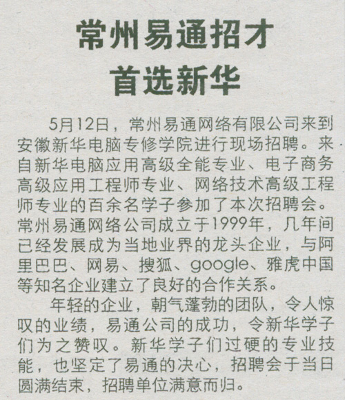 5月12日,常州易通网络有限公司来到安徽新华电脑专修学院进行现场招聘。来自新华—电脑应用高级全能专业、电子商务高级应用工程师专业、网络技术高级工程师专业的百余名学子参加了本次招聘会。常州易通网络公司成立于1999年,几年间已经发展成为当地业界的龙头企业,与阿里巴巴、网易、搜狐、google、雅虎中国等知名企业建立了良好的合作关系。