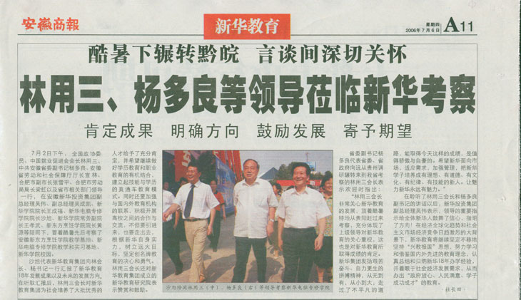 省委副书记杨多良代表省委、省政府向远从贵州调研辗转来到我省考察的林用三会长表示欢迎时指出:“林会长此次前来考察指导工作,表达了上级领导对我省民办教育的关心与支持,同时也是对新华教育集团坚持兴教报国理念所取得成绩的充分肯定。安徽省是个农业大省,多年来,省委、省政府一直高度重视民办教育工作,尤其是职业教育的发展。新华教育集团作为我省民办教育的领头羊,推动了我省高等教育和职业教育的发展步伐。希望新华教育集团在总结18年办学成果的基础上,着重做好以下三点工作:首先,要做好面向市场的职业教育,在课程体系、教学管理、就业指导等方面继续保持领先地位;其次,在办学方面要坚持走出去、请进来的思想,新华教育集团把总部迁往北京是个非常高瞻远瞩的举动,既然迈出了这一步,就要把国内外先进的办学思想和理念有机引用进来;第三,继续把技能教育与学历教育并举的教育模式推向深入,培养理论先进、技术扎实的适用型综合素质人才。”